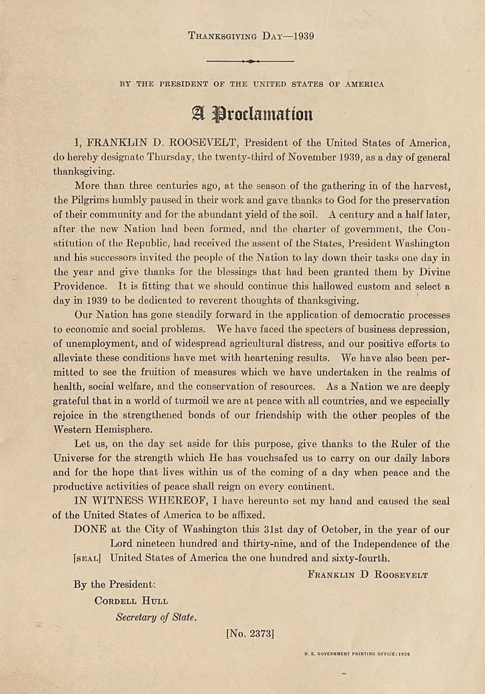 In October 1863, President Abraham Lincoln answered the call and issued a proclamation to set a single national Thanksgiving Day, inviting citizens to “set apart and observe the last Thursday of November next as a day of thanksgiving.” He set this day to celebrate even in the midst of war and called on the American people: "with humble penitence for our national perverseness and disobedience ... [to] fervently implore the interposition of the Almighty hand to heal the wounds of the nation...." It is interesting to note, and not surprising, that because of the ongoing Civil War, a nationwide Thanksgiving celebration was not actually realized until Reconstruction in the 1870s. Then, on October 31, 1939, President Franklin D. Roosevelt signed a presidential proclamation changing the holiday from the last Thursday in November, to the next to last Thursday in November.