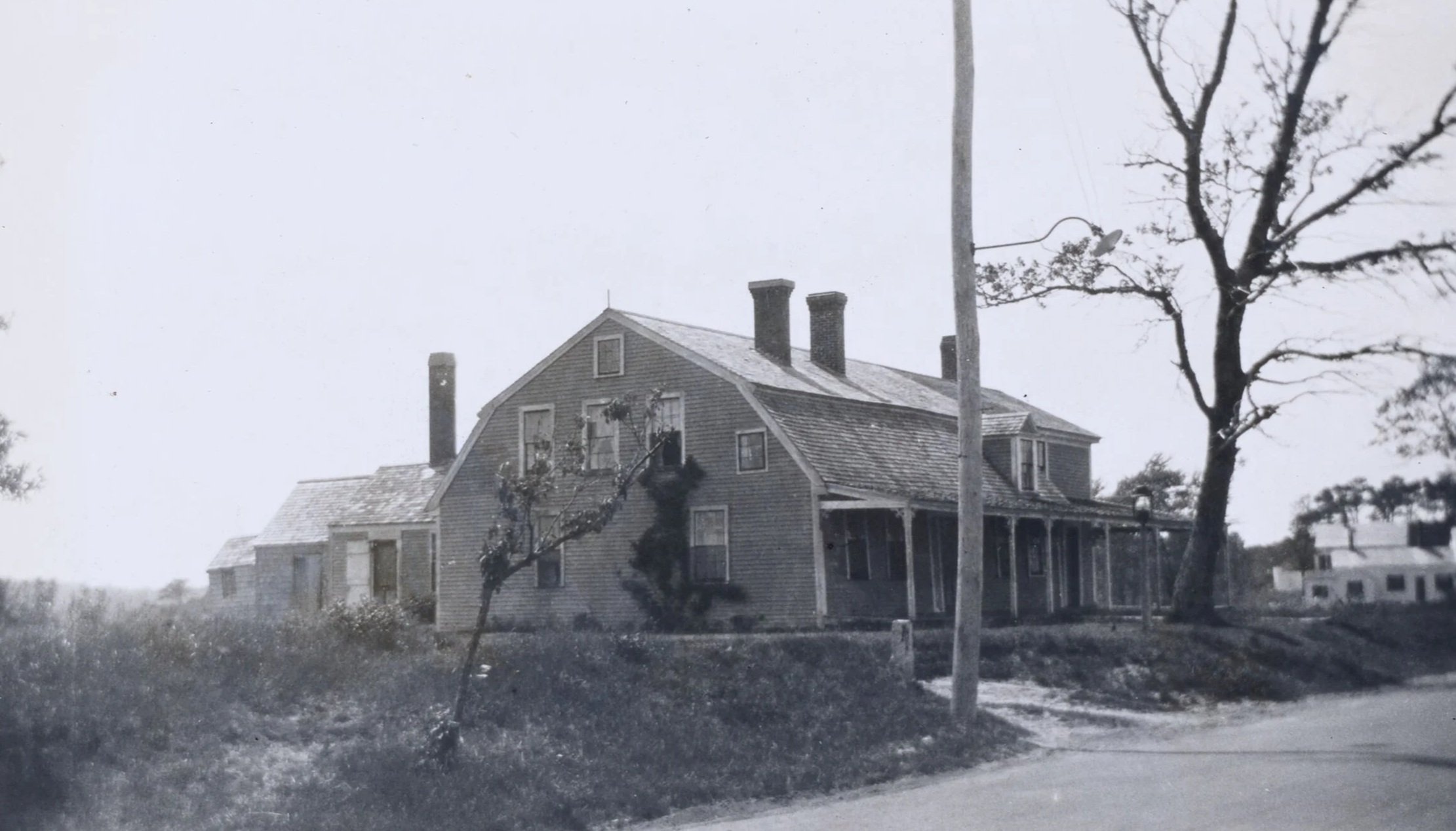 Opposite the [Chase] laundry is the 1750 House (formerly at 281 Route 28, now gone). This house with its curb roof is an old timer. It was built in Marstons Mills about the year 1750 and was moved to West Yarmouth about 1768. It was bought by Deacon Anthony Chase in the late 18th century. His son the Reverend Enoch E. Chase was born there, and died in 1887 in the same room in which he was born. Alexander B. Chase, son of Enoch, had a boarding house here called The Ocean View House.