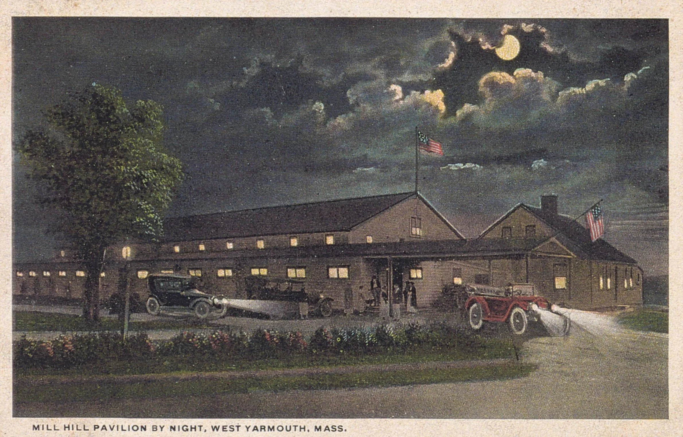 We now come to Mill Hill. On the south side of the highway stood the home of Eleazer Baker, and this hill was known as Eleazer's Hill. A dancing pavilion called Mill Hill Pavilion was erected and attached to the old house. Several years later fire destroyed the structure and the Rainbow Ballroom was built across the street. On the south side of the highway stood the residence of Captain Alexander Baxter, quite an extensive owner in shipping. Some years later this building was moved farther west to the corner next to a road leading to Lewis Bay, and a large double house was erected on the old site. Here the captain and his good wife resided for many years. In 1876 this fine residence was destroyed by fire.