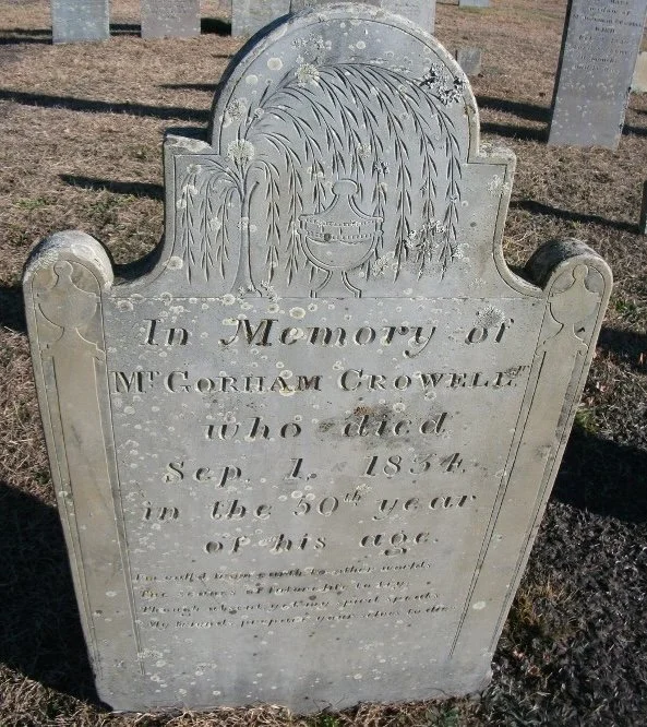 Going west along the county road we come to Woodside Cemetery. In the days when the cemetery was laid out it was customary to have the burial ground in the vicinity of the meeting house but at that time the people of South Sea (West Yarmouth) attended services on the north side of town, hence the desirability of a burial place near their home village. The earliest settlers were of limited means so the first burials were not marked by headstones. Yelverton Crow died in 1683; undoubtedly he is buried here in an unmarked grave with his many descendants.