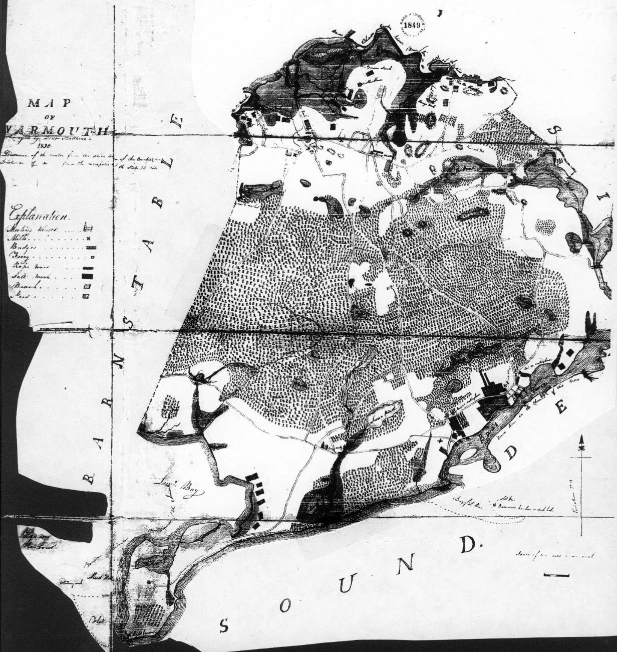 An 1830 map of Yarmouth, including Great Island at the bottom.