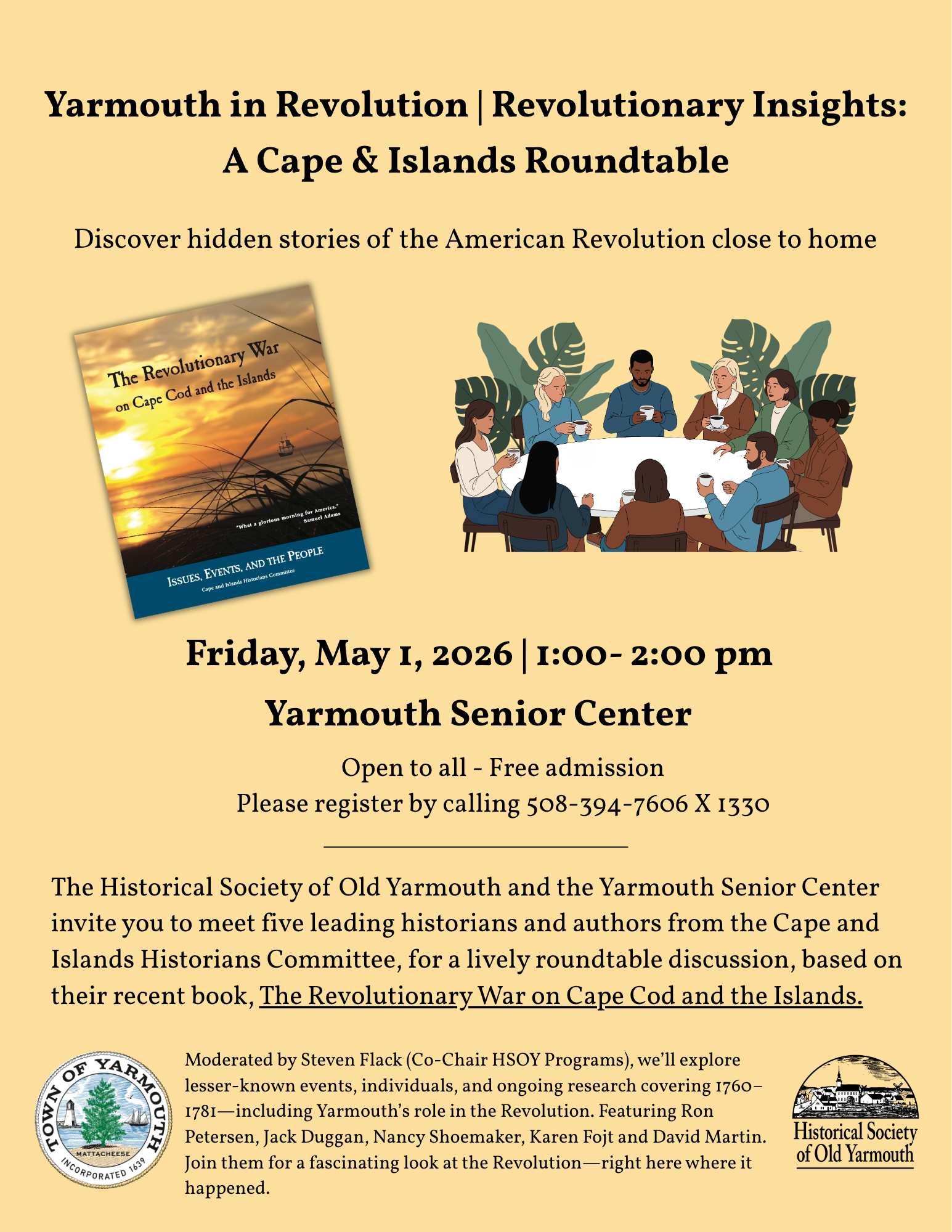 FRIDAY, MAY 1, 1PM – Roundtable discussion of the recent book The Revolution on Cape Cod and the Islands: Issues, Events, and People with co-author David Martin and other contributors. Yarmouth Senior Center. Please register by calling the senior center at 508-394-7606 X 1330.