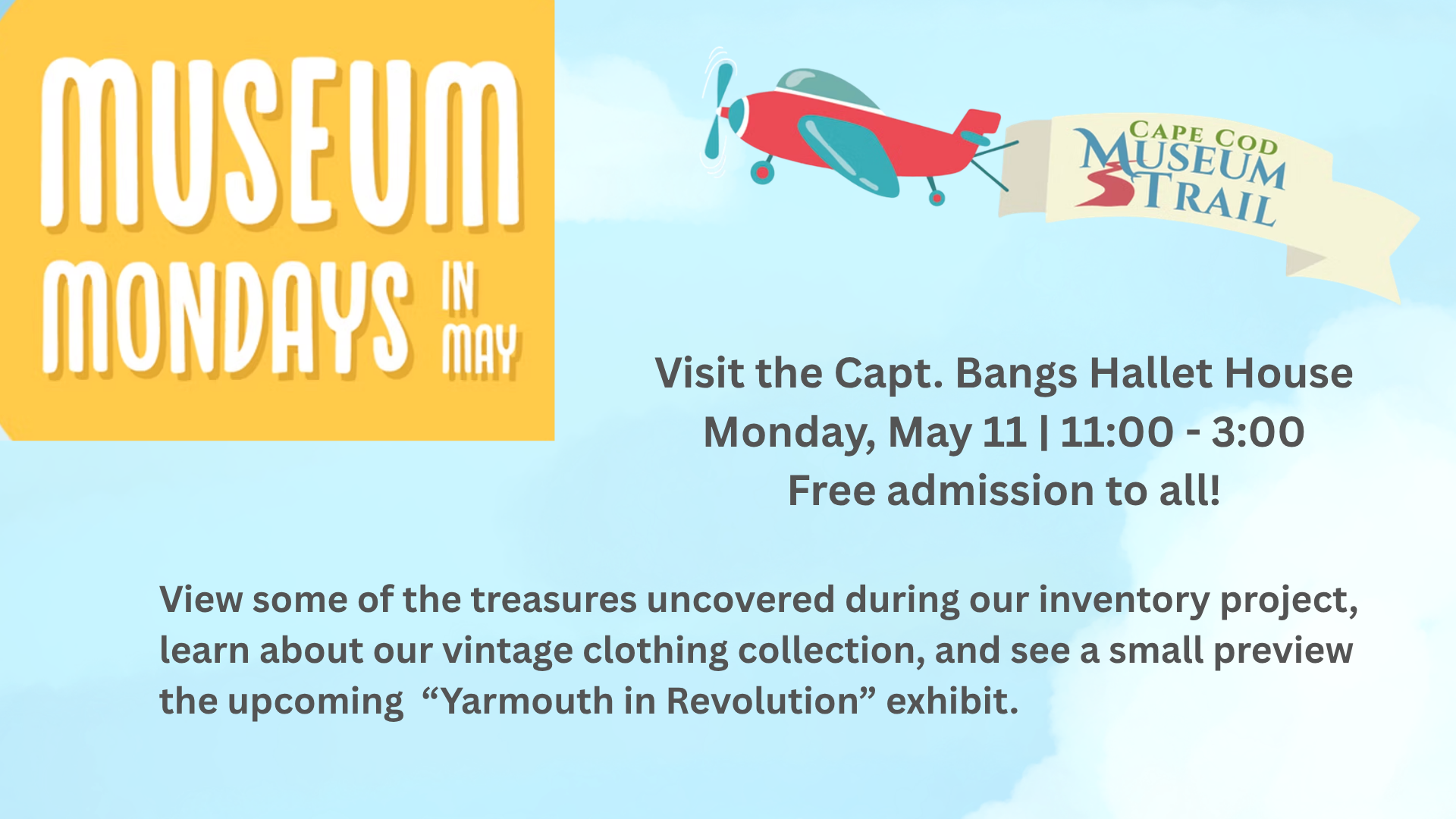 MONDAY, MAY 11, 11AM-3PM – Cape Cod Museum Trail’s Museum Monday in May at the Captain Bangs Hallet House Museum. Enjoy free admission to the Bangs Hallet House for an update on the inventory process, a look at some of the treasures uncovered during the project, learn about our vintage clothing collection, and see a small preview the upcoming “Yarmouth in Revolution” exhibit. 11 Strawberry Lane, Yarmouth Port